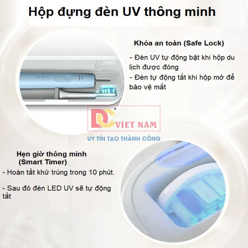 - Hộp đựng cao cấp cho phép bạn bảo quản bàn chải một cách vệ sinh, trong khi bộ sạc USB nhỏ gọn giúp sạc dễ dàng khi di chuyển. Bạn có thể sử dụng bàn chải trong 2 tuần chỉ với một lần sạc đầy. Ngoài ra, hộp sạc còn có tính năng khử trùng bằng tia UV, loại bỏ đến 99,9% vi khuẩn trên đầu bàn chải.