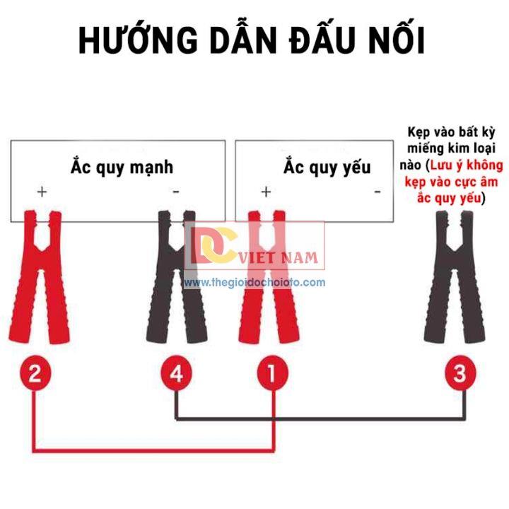 - Nối cực (+) của ắc quy hết điện với cực (+) của ắc quy mồi. Cẩn thận tránh các đầu kẹp chạm, chập vào nhau.