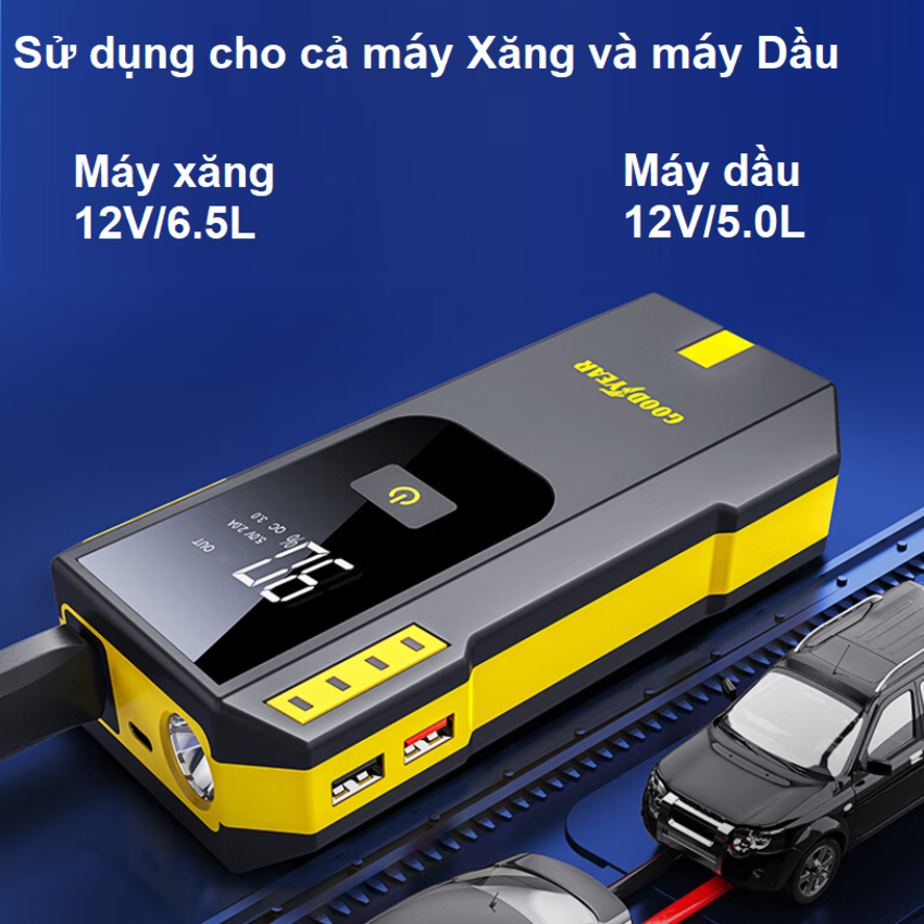 - Được sản xuất từ những linh kiện chất lượng cao với quy trình kiểm soát nghiêm ngặt bộ kích ắc quy ô tô Goodyear GY-5358 có khả năng cung cấp dòng lên đến 800A (peak current) cho phép khởi động gần như tất cả các dòng xe cá nhân và gia đình hiện nay. - -- Bên cạnh đó với dung lượng pin lưu trữ lên đến 12000mAh cho phép bạn có thể khởi động đến 45 lần cho một lần sạc đầy pin.