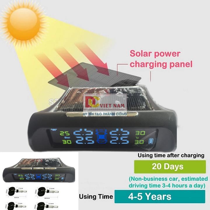 Thiết bị cảm biến áp suất và nhiệt độ lốp TPMS thông minh này sẽ có cảnh báo bằng âm thanh và hình ảnh tới bạn mỗi khi áp suất lốp quá thấp < 1,7 Bar hoặc > 3,3 Bar hoặc nhiệt độ lốp > 70*C.