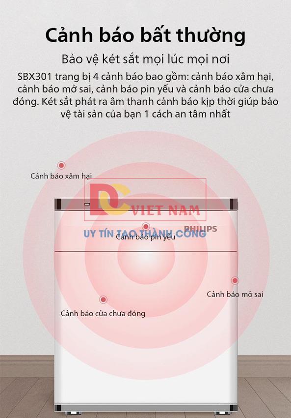 Két sắt Philips SBX301-5PC trang bị ngay trên mặt trước của két 4 cảnh báo thông minh: cảnh báo di chuyển, cảnh báo âm thanh báo động, cảnh báo nguồn, cảnh báo đóng mở. Bên cạnh đó két sắt còn thiết kế chân sạc cung cấp hệ thống điện cho két sắt phòng trường hợp hết pin.