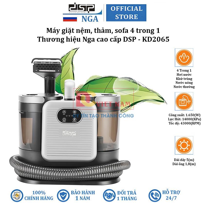 Máy giặt nệm, thảm, sofa bằng hơi nước nóng 4 trong 1 DSP KD2065 là dòng nâng cấp từ mã KD2047U sở hữu khả năng làm sạch, diệt khuẩn vượt trội. Không chỉ được ứng dụng để làm sạch giường đệm mà còn có thể vệ sinh sàn nhà, bàn ghế tại các khu vực phòng khách, nhà bếp trong gia đình, …