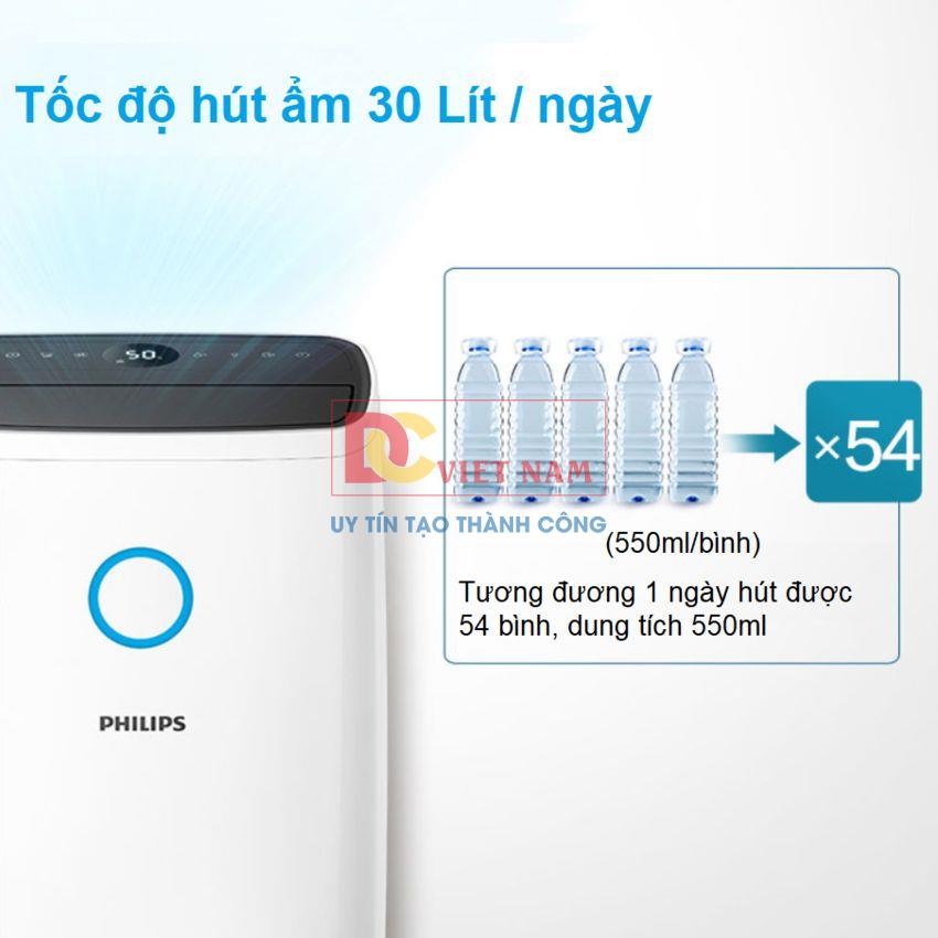 - Hệ thống mạnh mẽ hút 30 lít nước mỗi ngày, tương đương 54 chai nước, phù hợp cho phòng rộng tới 63m². Phòng 30m², giảm độ ẩm tương đối có hại cho sức khỏe từ 90% xuống mức có lợi cho sức khỏe là 60% trong 22 phút
