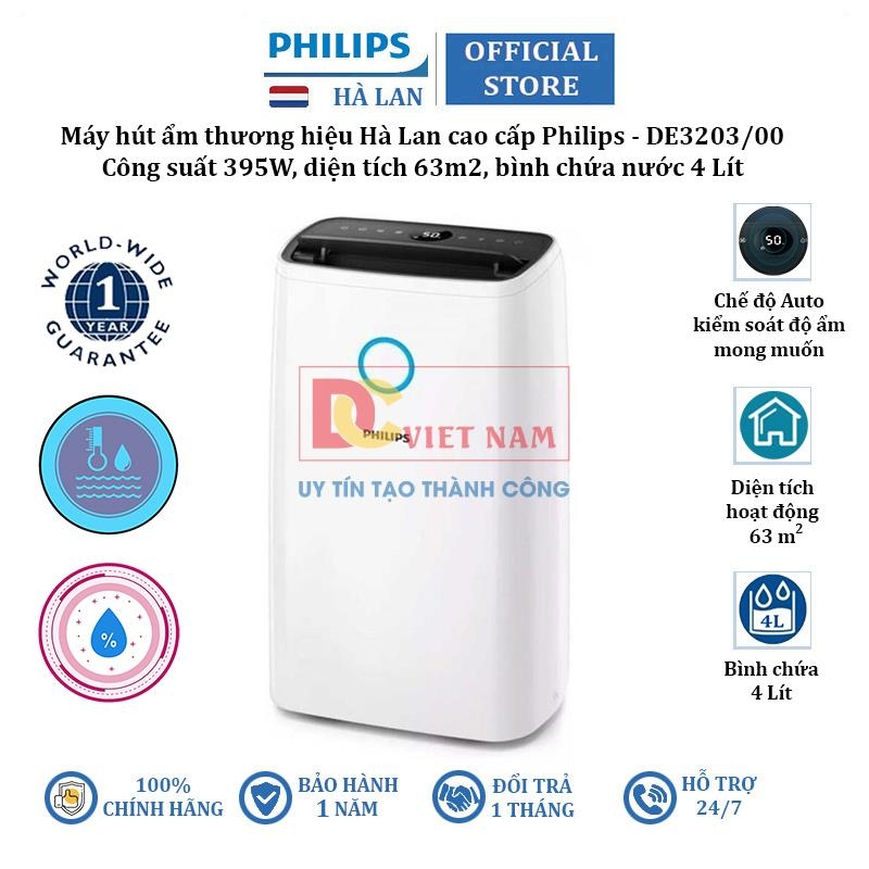 Philips là tên gọi phổ biến nhất của Koninklijke Philips Electronics N.V. (Royal Philips Electronics), là một công ty điện tử đa quốc gia Hà Lan và là một trong những công ty điện tử lớn nhất thế giới. Không chỉ sản xuất điện tử tiêu dùng, chiếu sáng, thiết bị y tế… Mà còn sản xuất máy hút ẩm kiêm lọc không khí trong nhà nổi tiếng với chất lượng tốt nhất. Máy hút ẩm Philips DE3203/00, là dòng máy đời mới, hiện đại, tối ưu cho bầu không khí trong lành, dễ thở nhất đặc biệt là trong những ngày trời nồm, ẩm ướt.