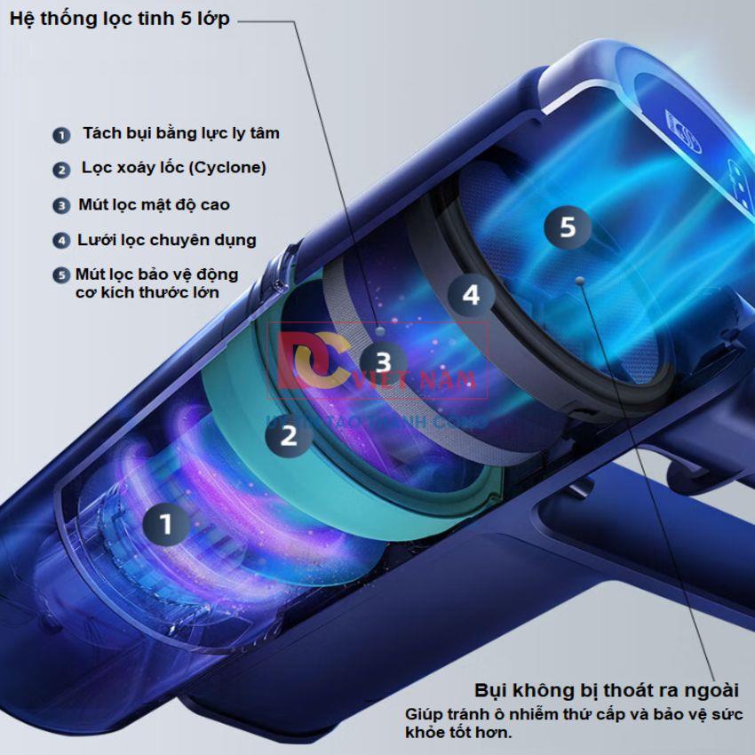 - Hệ thống lọc hiệu suất cao giúp giữ lại tới 98,5% hạt bụi siêu nhỏ, ngăn bụi quay trở lại không khí và giữ cho không gian sống sạch hơn.