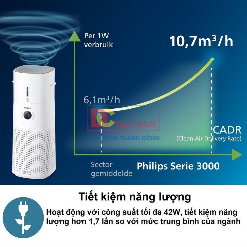 - Nhờ thiết kế tiết kiệm năng lượng, máy chỉ sử dụng tối đa 42W để lọc và tạo ẩm, ít hơn bóng đèn truyền thống.