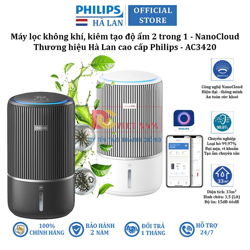Philips AC3420 là một máy lọc không khí và tạo ẩm 2 trong 1, có công suất lọc mạnh mẽ cho phòng rộng tới 32.5m². Sản phẩm có khả năng loại bỏ bụi mịn PM2.5, các chất gây ô nhiễm và bổ sung độ ẩm, phù hợp với những ai muốn cải thiện chất lượng không khí trong nhà, đặc biệt là gia đình có trẻ nhỏ hoặc người nhạy cảm