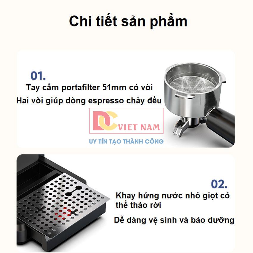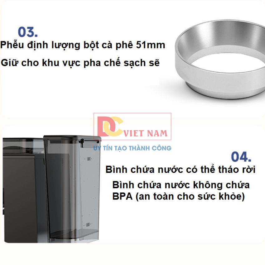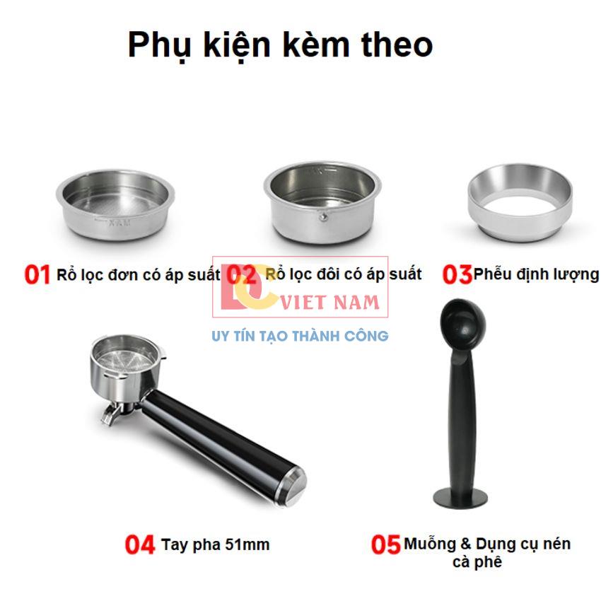 * Bộ phụ kiện bao gồm: 1 máy chủ; 1 tay pha 51mm ; x2 phin lọc inox ; 1 tay nén kiêm thìa; 1 phễu định lượng; 1 sách HDSD
