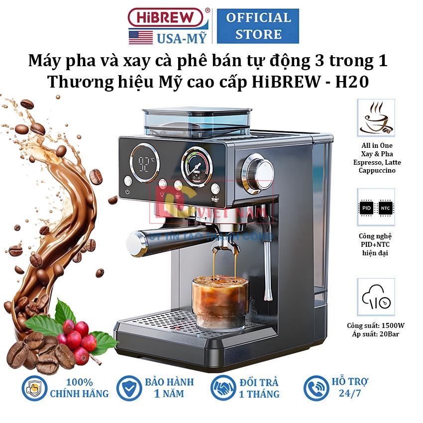 Máy pha cà phê Espresso 3 trong 1 HiBREW H20 là dòng máy mới nhất. Dòng máy pha cà phê bán tự động nhỏ gọn có khả năng pha chế thành nhiều loại cà phê thơm ngon khác nhau như Espresso, Capuchino, Latte ...Đồng thời kết hợp với hệ thống máy xay chuyên dụng 20 chế độ tiện ích và chuyên nghiệp.