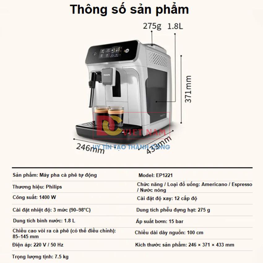 - Máy pha cafe Philips EP1221/69 vận hành với áp suất bơm mạnh mẽ 15 bar, đảm bảo chiết xuất tối đa hương vị và lớp crema mịn cho mỗi tách Espresso.