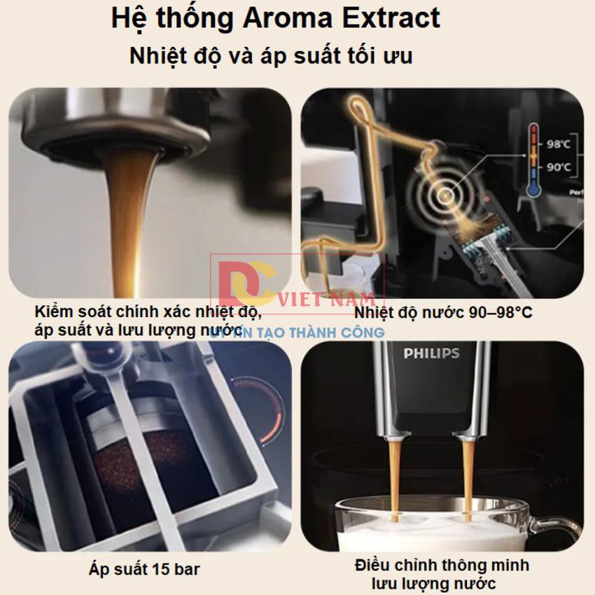 - Công nghệ pha chế Aroma Extract của Philips EP1221/69 mang đến sự cân bằng hoàn hảo giữa nhiệt độ pha và chiết xuất hương thơm, giúp tạo ra những tách cafe đậm đà và thơm ngon. Hệ thống này duy trì nhiệt độ nước ổn định từ 90°C đến 98°C, đồng thời điều chỉnh lưu lượng nước để tối ưu hóa quá trình chiết xuất, đảm bảo hương vị cafe được phát triển đầy đủ. Kết quả là mỗi tách cafe đều c ó hương thơm ngào ngạt và lớp crema mịn màng, hoàn hảo.