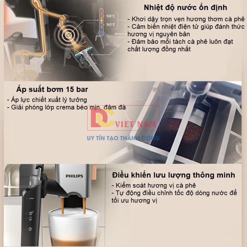 - Ngoài ra, Philips đã phát triển một hệ thống pha cà phê độc đáo đảm bảo chiết xuất hoàn hảo hương vị của hạt cà phê nhờ tốc độ dòng chảy và nhiệt độ thấp hơn. Điều này giúp giữ lại hương vị tự nhiên của cà phê, đồng thời đảm bảo sự cân bằng hoàn hảo giữa hương thơm, độ mạnh, và nhiệt độ trong từng ly cà phê.