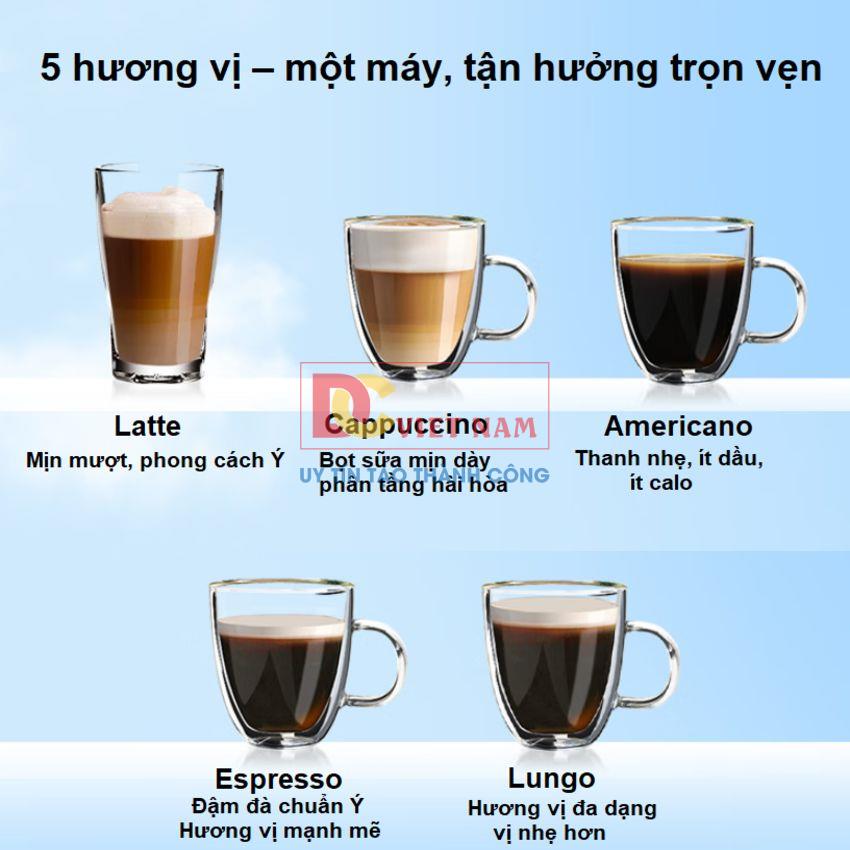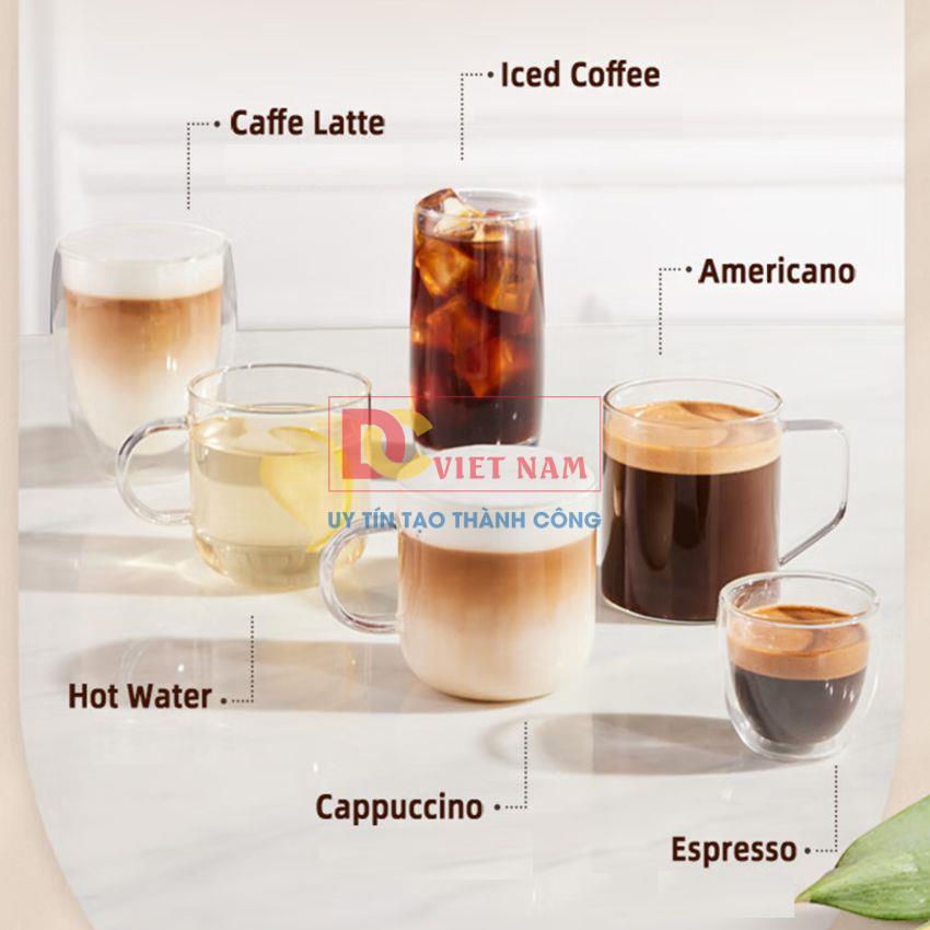 - Chức năng pha chế tự động: Espresso, Americano, Cappuccino, Caffe Latte, Iced Coffee, Nước nóng