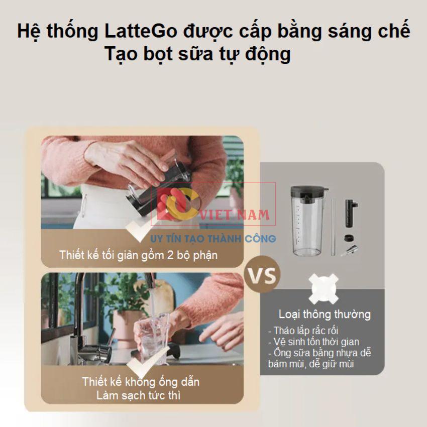 - Hệ thống LatteGo tạo bọt sữa mịn và mượt, phù hợp cho cappuccino hay latte. Các bộ phận không có ống dẫn phức tạp, dễ tháo rời và vệ sinh.