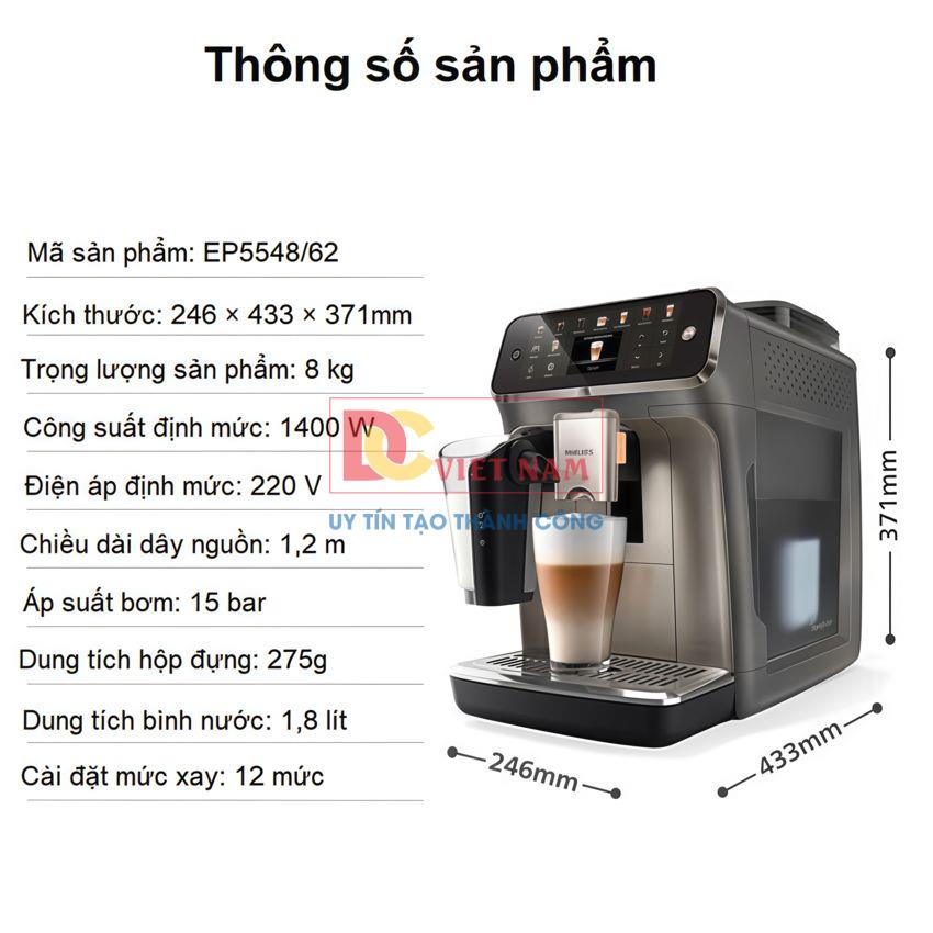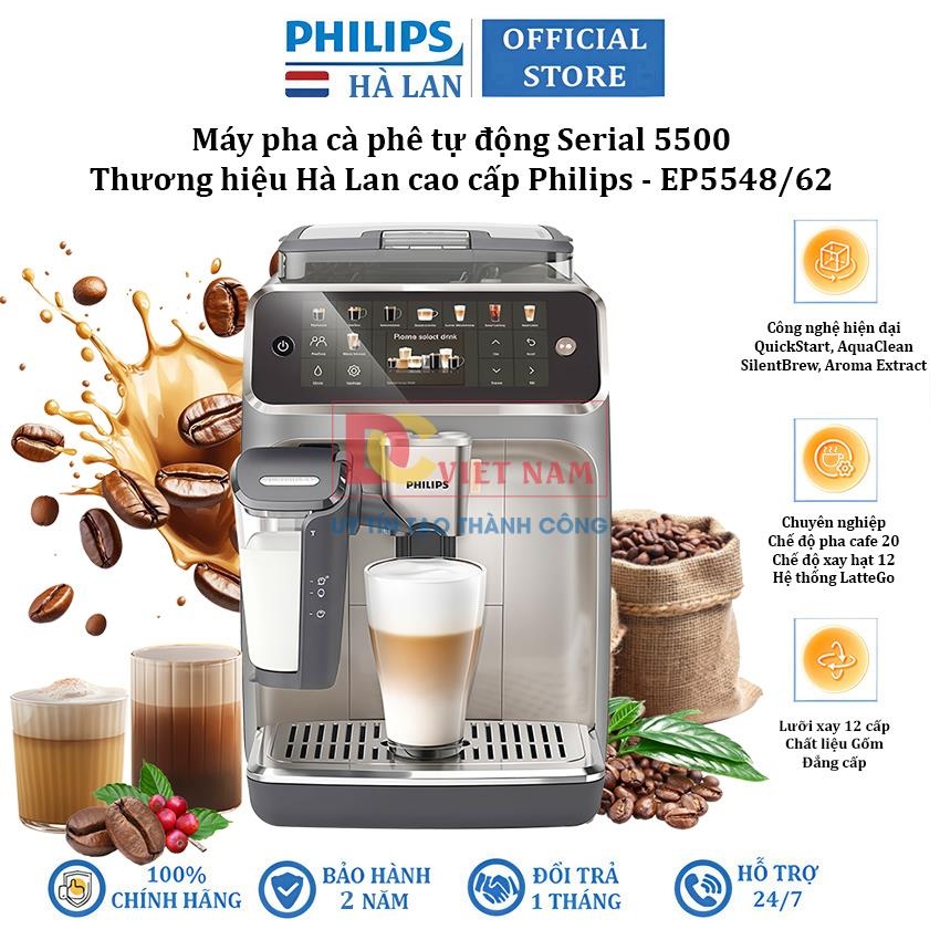 Máy pha cafe tự động Philips EP5548/62 Serie 5500 là lựa chọn lý tưởng dành cho những người mong muốn thưởng thức đa dạng cà phê một cách tiện lợi ngay tại nhà. Với 20 công thức đồ uống từ Espresso đến Latte macchiato, công nghệ Aroma Extract cân bằng tối ưu nhiệt độ pha và hương thơm được chiết xuất, hệ thống đánh sữa tự động LatteGo và nhiều tiện ích hiện đại khác,… thiết bị sẽ mang tới cho người dùng những tách cà phê đậm đà và chất lượng nhất