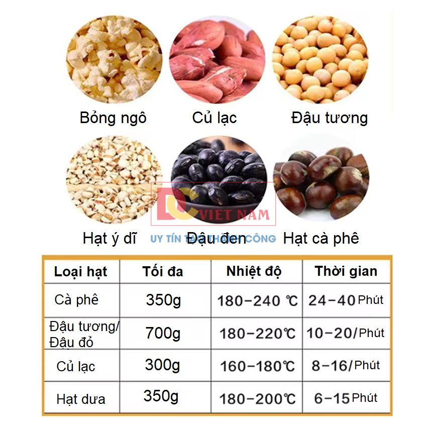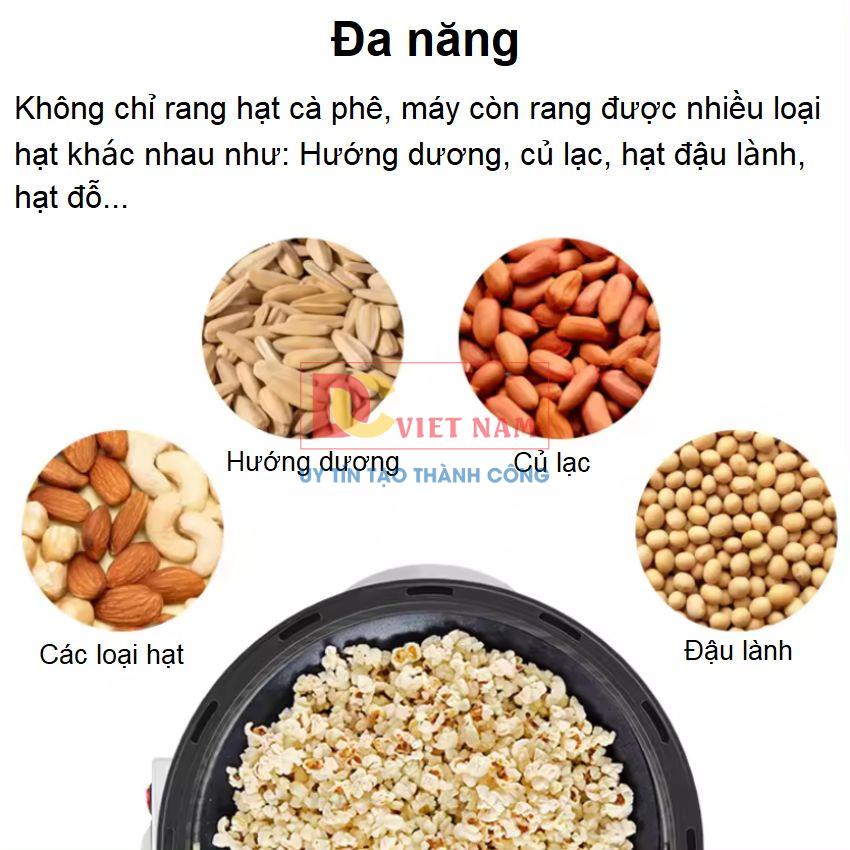 - Máy rang hạt cà phê có công suất lên tới 800W, có thể rang 300-350 gram hạt cà phê trong 25 phút, 250-300g với hạt lạc.