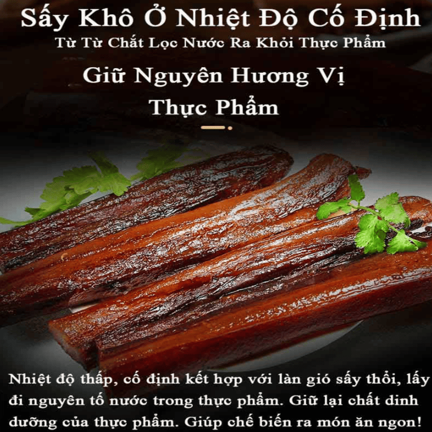 - Chính hệ thống gia nhiệt 360 độ thông minh này giúp thực phẩm được sấy chín đều, ngon và khô nhanh hơn từ 40 đến 50% so với dòng mày thường. Rút ngắn thời gian sấy và tiết kiệm điện năng tiêu thụ đáng kể. Đây chính là điểm khác biệt lớn so với các dòng máy thông thường.
