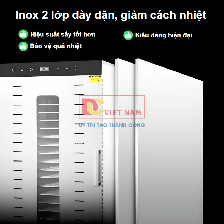 - Máy sấy thực phẩm 24 khay, sử dụng hệ thống gia nhiệt vô cùng thông minh và tự động. Toàn bộ 24 khay được gia nhiệt đều 360 độ tự động hoàn toàn giúp dòng khí được gia nhiệt thổi và phân phối khí đều các mặt, tiếp cận trực tiếp từng khay thực phẩm từ đa hướng