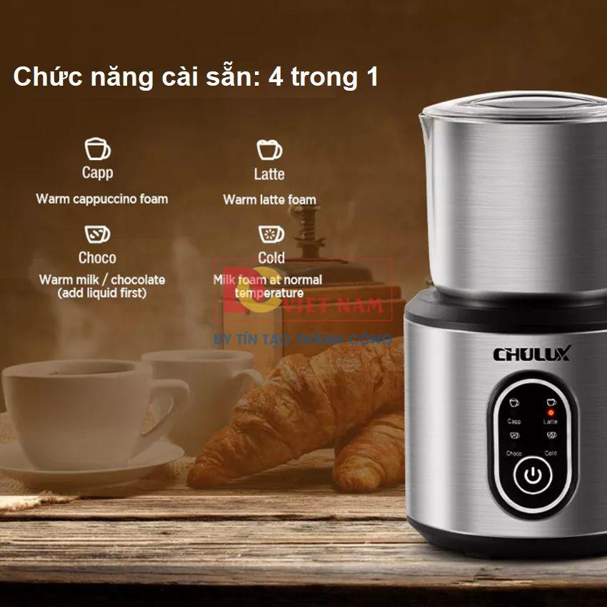 - Máy tạo bọt sữa chuyên nghiệp dùng cho quán 4 trong 1 Chulux JMF-988S là sản phẩm cao cấp chuyên dùng cho quán cà phê, dùng để đánh sữa tạo bọt và pha các loại thức uống nóng lạnh. Máy sở hữu dung tích lớn, tốc độ mạnh, không phát ra tiếng ồn, dung tích lớn, thiết kế sang trọng.