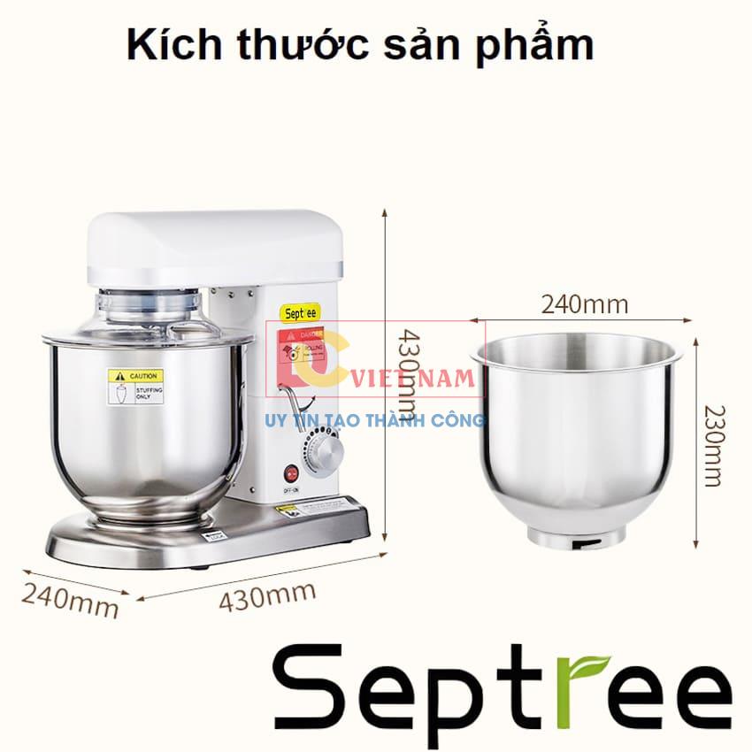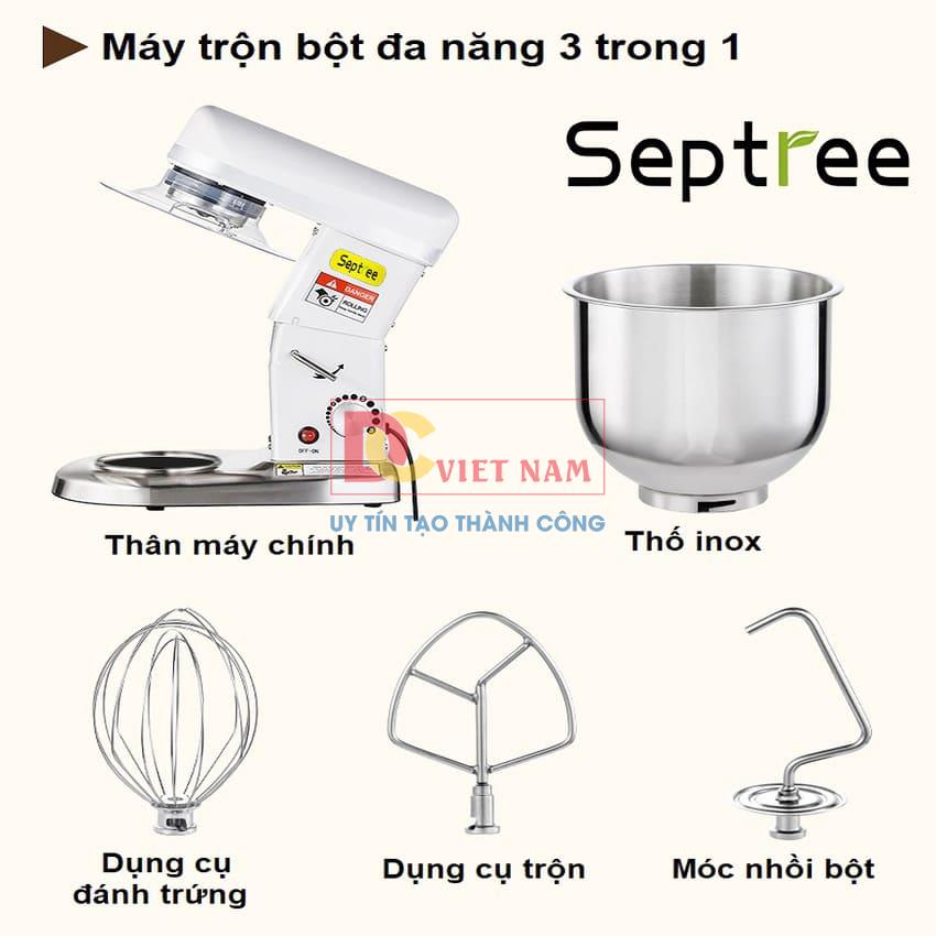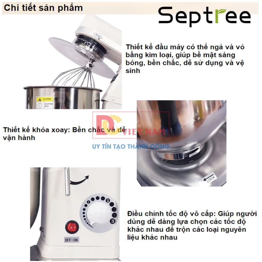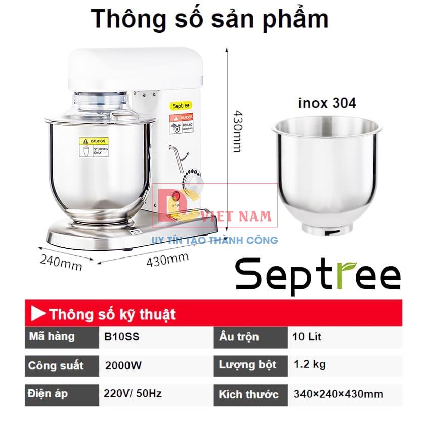 Giới thiệu Máy trộn bột, đánh kem công nghiệp 3 trong 1,10 lít Septree B10SS và B10 là loại thiết bị dùng để trộn các nguyên liệu như bột, trứng, đường, kem, hoặc các thành phần khác trong làm bánh và chế biến thực phẩm. Với dung tích 10 lít, máy này có thể trộn một lượng nguyên liệu khá lớn rất phù hợp với các tiệm bánh, nhà hàng, quán ăn...