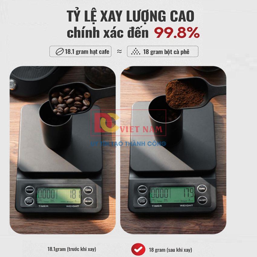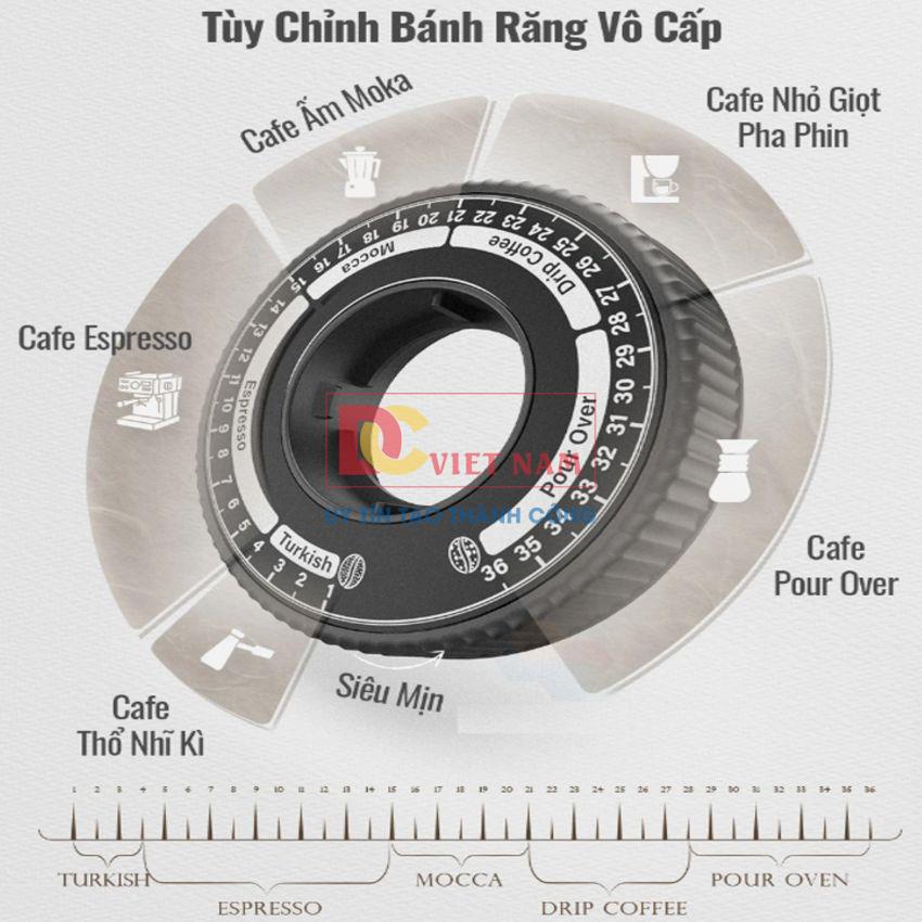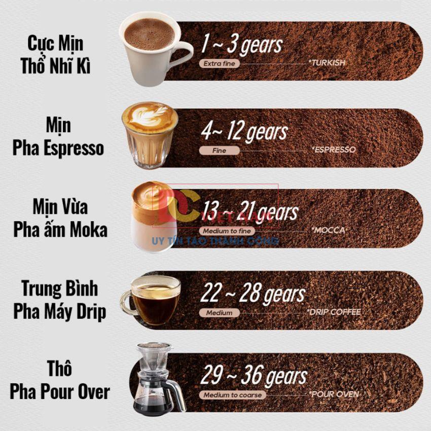 - Với lưỡi dao chất liệu thép không gỉ SS420 bền bỉ bền bỉ sở hữu 36 cấp độ xay, từ dạng thô đến dạng mịn. Chính vì thế nó có thể đáp ứng tối thiểu độ mịn cho 1 ly cà phê espresso chuẩn Ý.