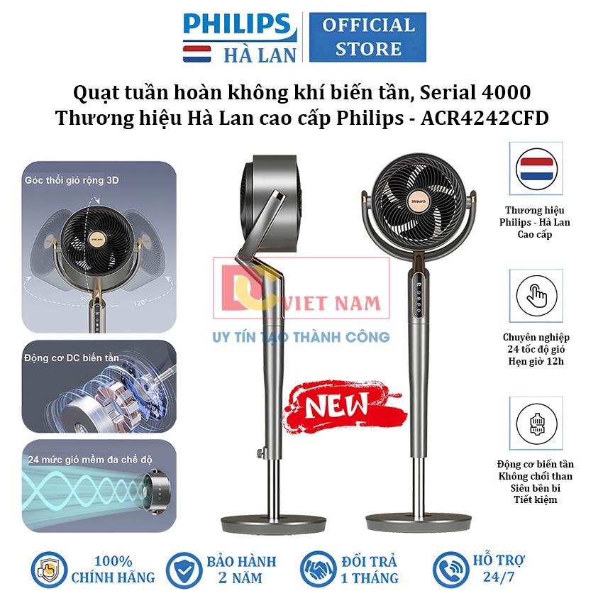 * ACR4242CFD: 5 cánh quạt, đường kính cánh quạt 230mm, đảo gió lên xuống 95° và 120°, tầm xa gió 10m, nâng giảm chiều cao chỉ cần vặn núm, công suất 35W, thuộc dòng Serial 4000 .